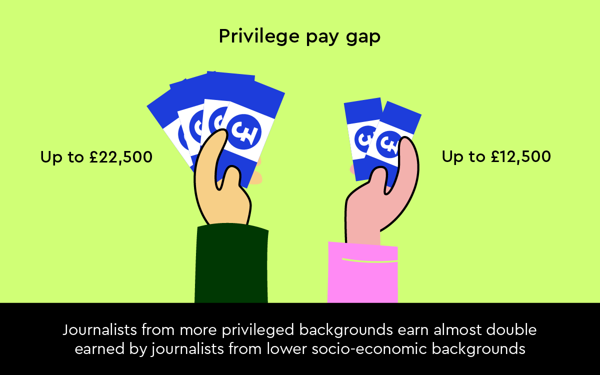 The research also demonstrated that freelance journalism is an overwhelmingly white, middle class, occupation. Most freelance journalists came from professional family backgrounds (63%), whereas only 19% came from “lower” socio-economic backgrounds. Journalists from lower socio-economic backgrounds were found to earn nearly half that of journalists from more privileged backgrounds.