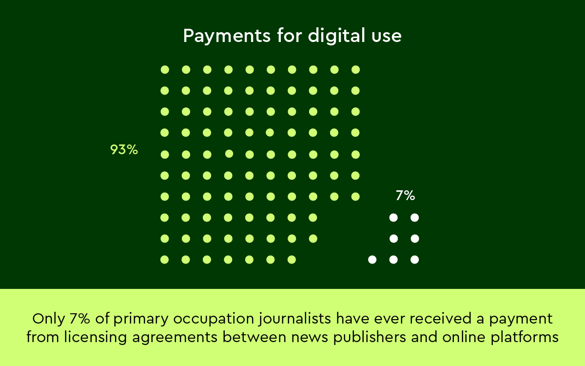 Whilst there are piecemeal licensing agreements in place between publishers and online platforms in the UK for secondary uses like ‘news scraping’, the survey found the vast majority (93%) of freelance journalists have never received a payment from this source. This is despite the increasing significance of secondary uses for online content.